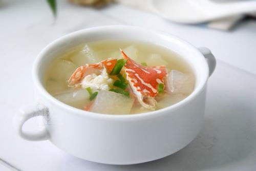 海鲜冬瓜汤:鲜虾、花蛤、冬瓜、葱姜、香菜、盐、鸡精、香油。做法:锅里放入清水、葱段、姜丝烧开,分别下海虹、花蛤汆至开口捞出;再将鲜虾入锅汆至虾身弯曲,虾壳变红后捞出;将锅中的汤汁过滤后再重新放入锅中,加入冬瓜块炖煮约10分钟左右至冬瓜酥软;将汆烫过的鲜虾、花蛤放入冬瓜汤里,调入盐和鸡精;煮开后滴入香油,撒上香菜段即可。开胃祛湿。