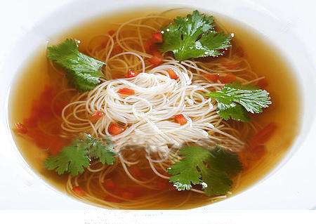 香菜面条:鲜香菜100克,挂面500克,红辣椒1只。香菜洗净沥水,红椒切丝备用;将鸡汤或牛肉汤1500毫升烧开,再放入挂面,待八九分熟,入香菜、红椒丝、精盐少许,香菜入味即可起锅。开胃和中,增进食欲, 用于腹胀,不欲饮食,体倦乏力等;